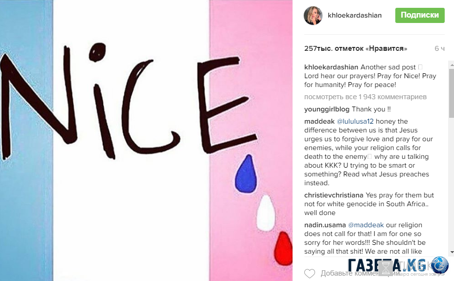 Хлое[/b] Кардашян[/b]: «Еще один печальный пост. Бог слышит наши молитвы. Молимся за Ниццу! Молимся за человечество. Молимся за мир!»