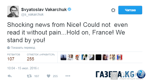Святослав Вакарчук: «Срочные новости из Ниццы! Не мог даже читать без боли ... Держись, Франция! Мы с тобой!».