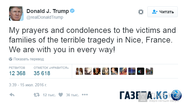 Дональд[/b] Трамп[/b]: «Мои молитвы и соболезнования по жертвам трагедии и их семьям. Мы полностью поддерживаем вас!».