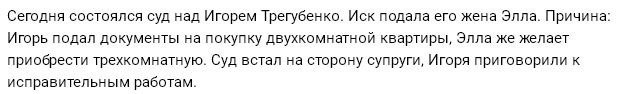 Дело в том, что Игорь собирался приобрести двухкомнатную квартиру, что в корне не устраивало Эллу, которая мечтала о «трешке». В конечном счете, выслушав за и против, суд встал на сторону Эллы, приговорив Игоря к исправительным работам.
