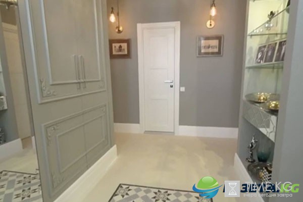 Краски для стен были выбраны английские, экологически чистые, их делают в Великобритании с соблюдением строжайших норм. Шкаф в холле выполнен классическом стиле, сделан по индивидуальному проекту. Фасад дверей украшен декором, который был заказан в Италии. Он создает ощущение аристократического шика и в тоже время не выделятся слишком явно. Слева от дверей в гостиную теперь находится стеклянный шкаф, он предусмотрен – специально для размещения наград Полины Гагариной. Входные двери в гостиную ванильного цвета и сделаны по принципу купе. Они бесшумные и очень элегантные.