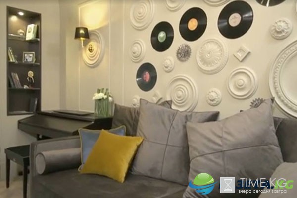 Одна из стен гостиной очень оригинально украшена. Во-первых, использовались полиуретановые розетки нескольких видов в виде стилизованных цветов. Во-вторых, в качестве декора присутствуют виниловые пластинки и несколько металлических шестеренок – они должны добавить в интерьер брутальности и напомнить, что комната является мужской.