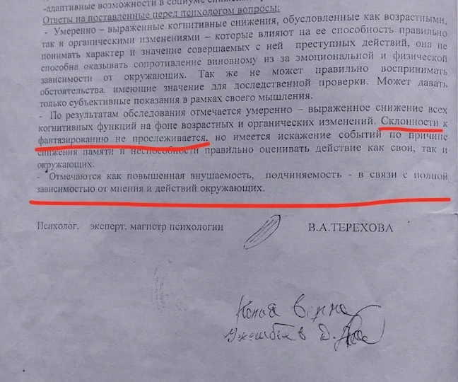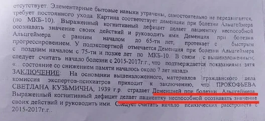 Судебный процесс длится уже пять лет. За это время бабушка дважды проходила судебно-психиатрическую экспертизу. В 2024 году ей был официально поставлен диагноз деменция при болезни Альцгеймера, который подтвердили другие врачи в 2025 году.