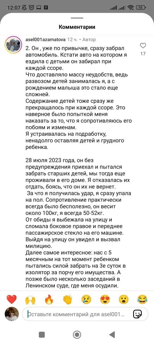 Асель призналась, что спустя время решила простить своего мужа, находясь в зависимости от него, однако ни пьянство, ни измены, ни насилие не прекратились, что привело ее к решению о разводе.