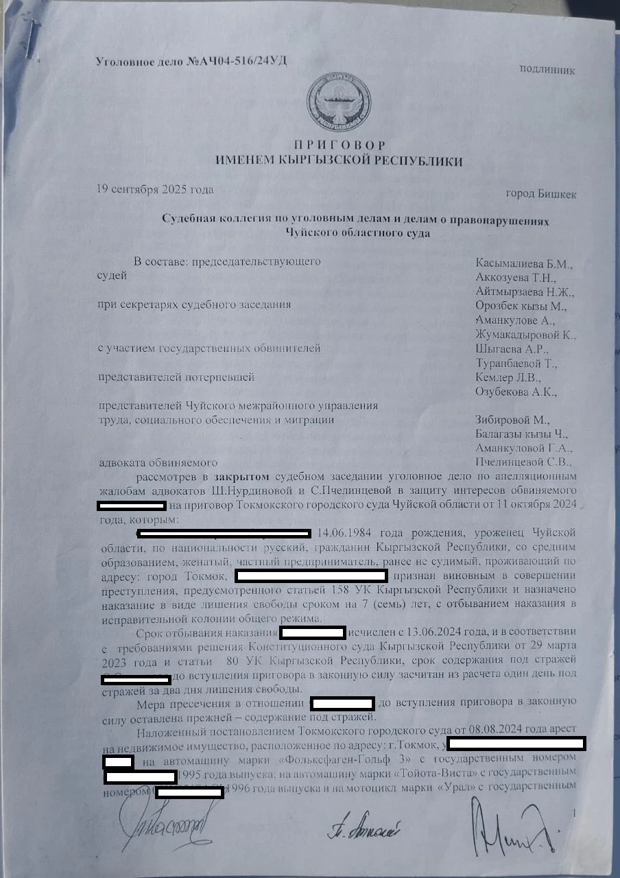«Суды первой инстанции длились около полугода, и в итоге его осудили на семь лет по статьям 158 (развратные действия) и 34 (продолжаемое преступление). За это время у ответчика сменилось три адвоката, а нас защищает государственный адвокат. Они подали апелляцию в областной суд, и было более 12 заседаний, на одном из которых полностью сменился состав судей. В итоге областной суд оставил приговор без изменений. С.С. был направлен в колонию № 10 в Джалал-Абаде, где провел всего несколько месяцев, после чего его адвокат подал кассацию в Верховный суд с просьбой отменить приговор», — продолжила Лина.