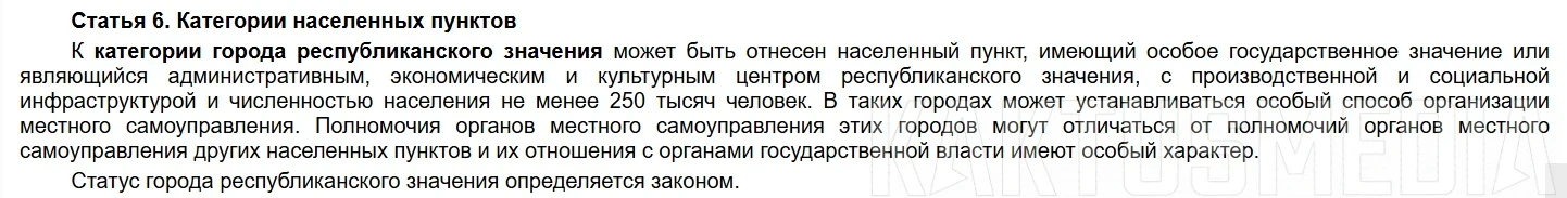 Согласно статье 6 Закона "Об административно-территориальном устройстве Кыргызской Республики", населенный пункт может быть отнесен к категории города республиканского значения, если он имеет особое государственное значение или является административным, экономическим и культурным центром с развитой производственной и социальной инфраструктурой, а также численностью населения не менее 250 тыс. человек. В таких городах могут устанавливаться особые правила местного самоуправления, и их полномочия будут отличаться от полномочий органов местного самоуправления других населенных пунктов.Статус города республиканского значения определяется законом.