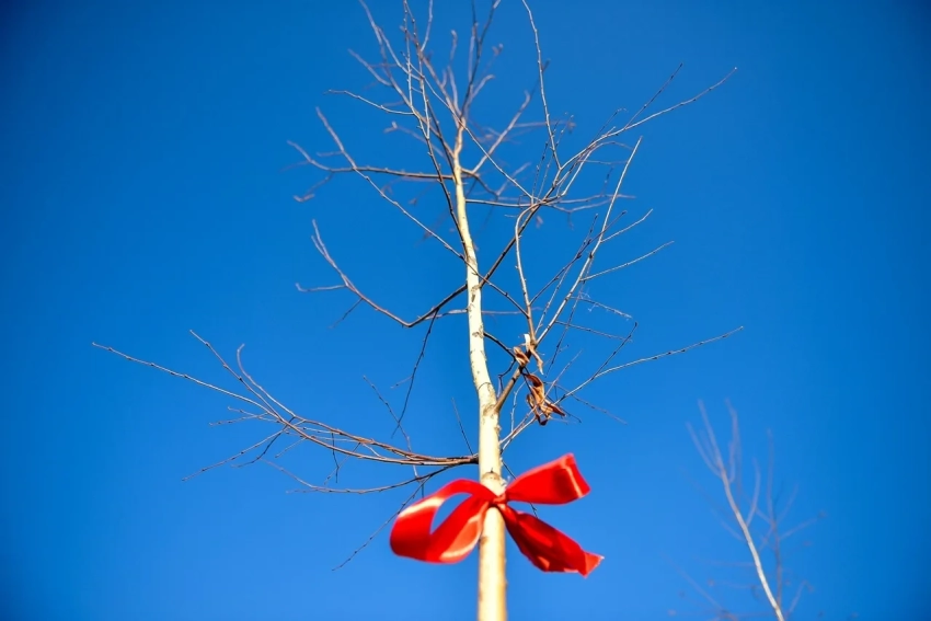 После завершения посадки мэр символически завязал ленточки на новых деревьях, подчеркивая важность заботы о зеленых насаждениях.