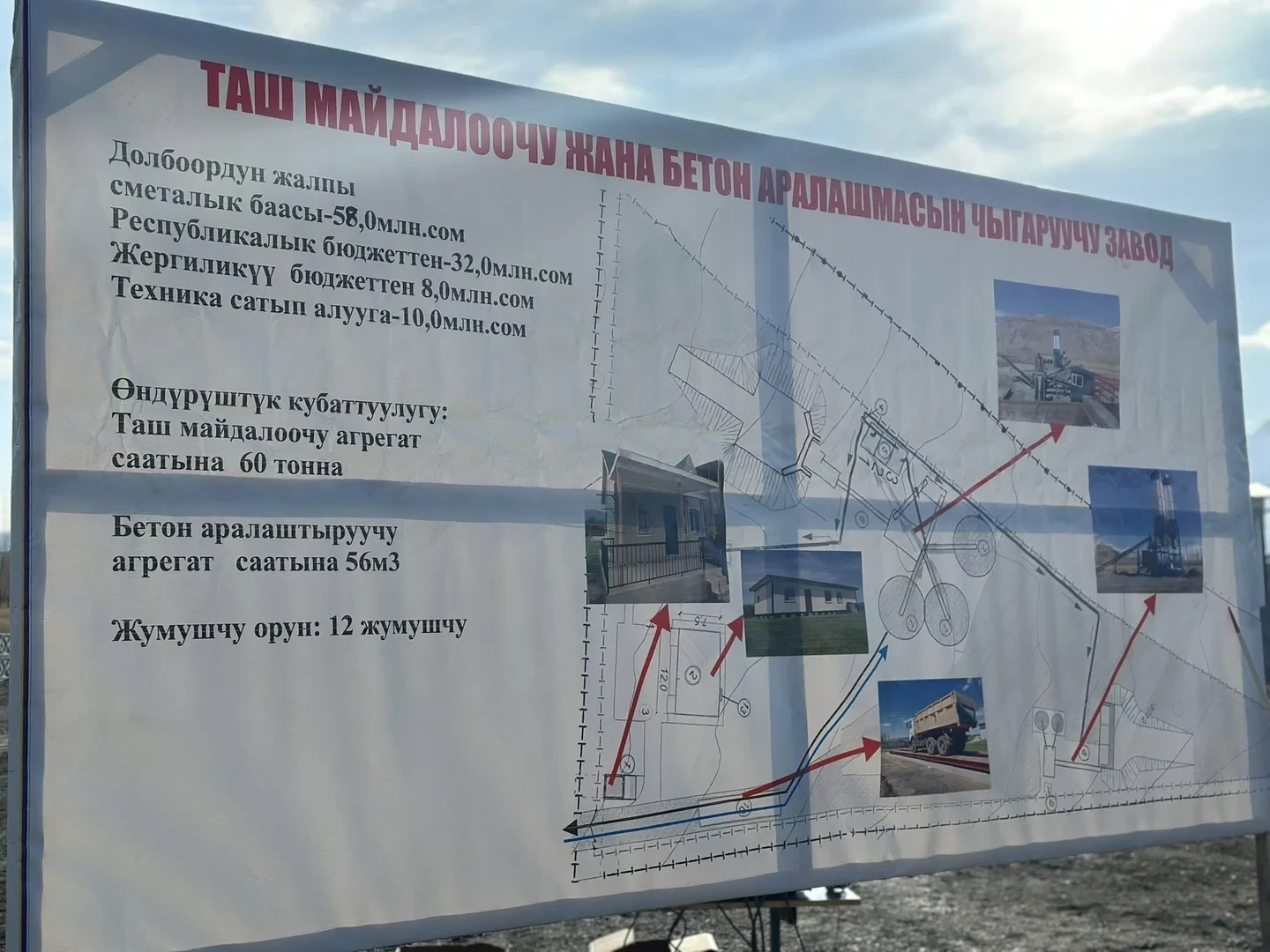 На строительство завода было выделено 32 миллиона сомов из республиканского бюджета, который в целом составляет 500 миллионов сомов на развитие региона. Дополнительно из местного бюджета было потрачено 20 миллионов сомов.