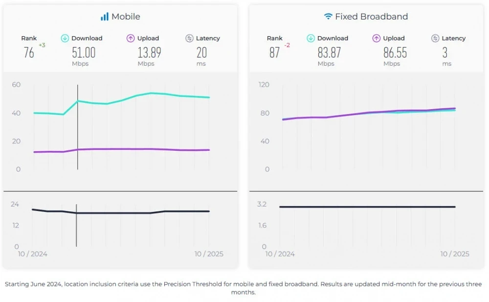Что касается стационарного интернета, то здесь Кыргызстан также сохранил свои позиции, находясь на 87-м месте с показателями загрузки 83,87 Мбит/с и отдачи 86,85 Мбит/с, а задержка составила всего 3 мс. В январе средняя скорость загрузки была 74,43 Мбит/с, отдача — 86,55 Мбит/с, задержка также оставалась на уровне 3 мс.