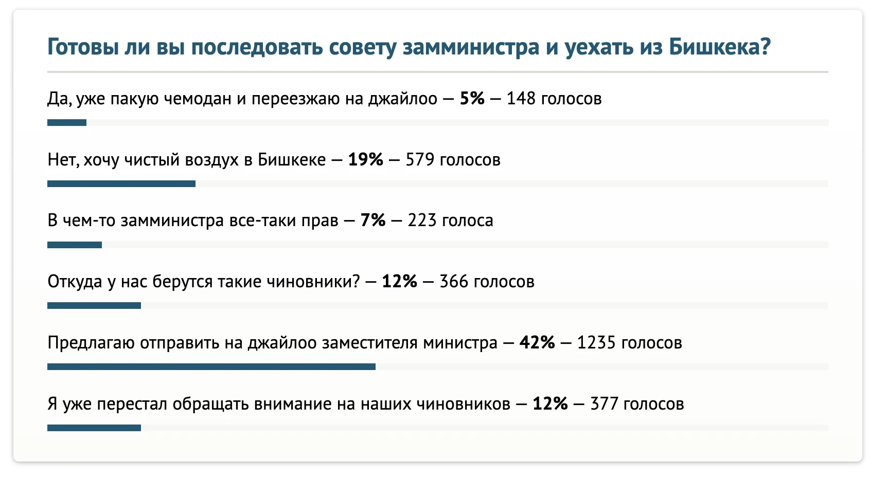 — 42 процента опрошенных (1 тысяча 232 голоса) предложили отправить заместителя министра на джайлоо;