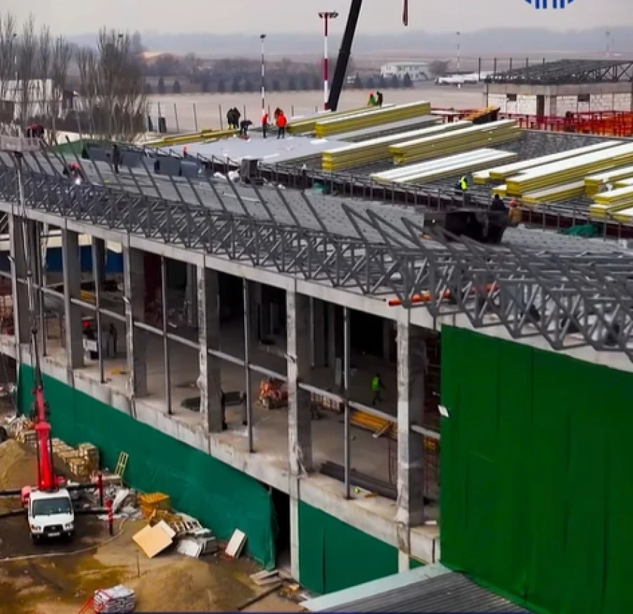 На данный момент работы проводятся в блоках А, Б, В, Г и Д, где осуществляется монтаж внутренних инженерных систем, установка металлических конструкций крыши и выполнение дополнительных работ на внутренних стенах.