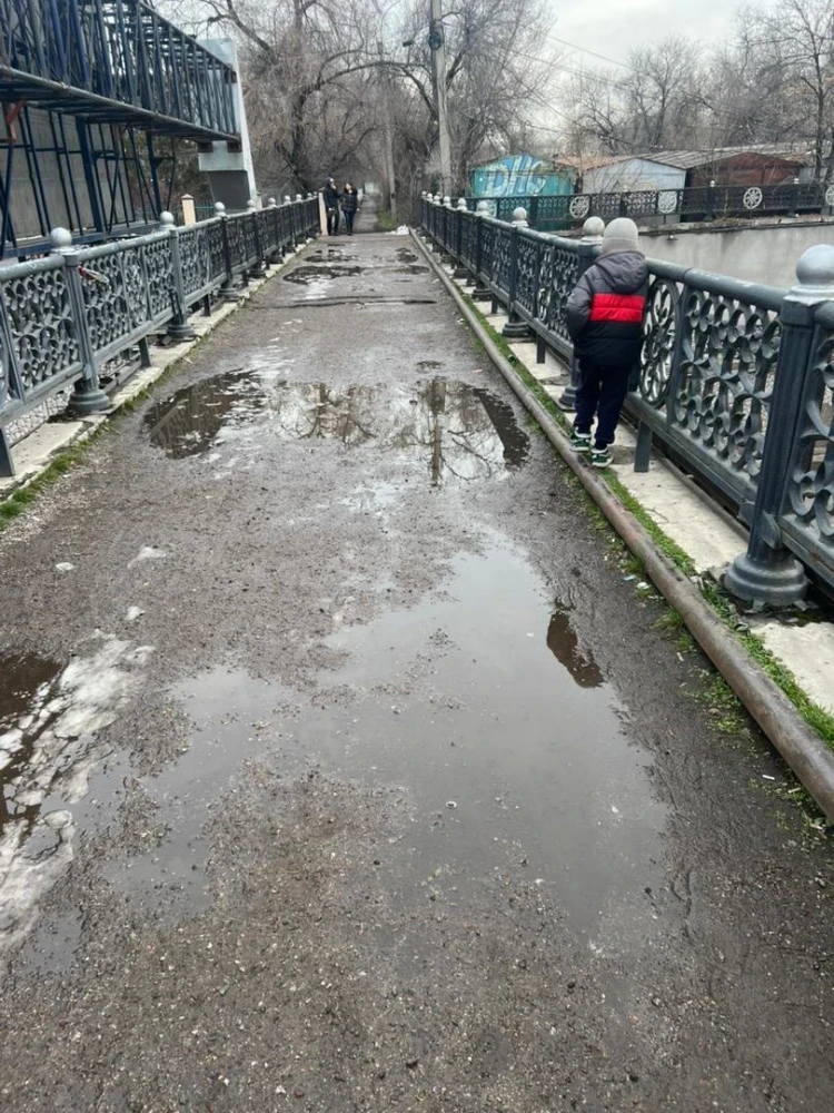 "Мост между улицами Боконбаева и Льва Толстого находится в крайне плохом состоянии. Вечером здесь темно, а дорога покрыта ямами. В дождливую погоду на мосту образуются огромные лужи, и пешеходам приходится идти по краю. Эта дорога – основная для нас, особенно когда проспект Айтматова закрыт," - поделилась она своими опасениями.