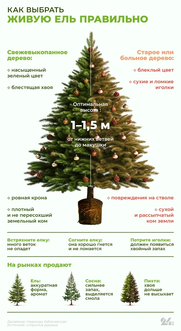 В этом году живые ели вновь подорожали. В магазинах Бишкека можно найти пихты, голубые ели и тянь-шаньские ели. Продавцы отмечают, что в преддверии праздников спрос на хвойные деревья значительно возрастает — в день продается до семи елок.