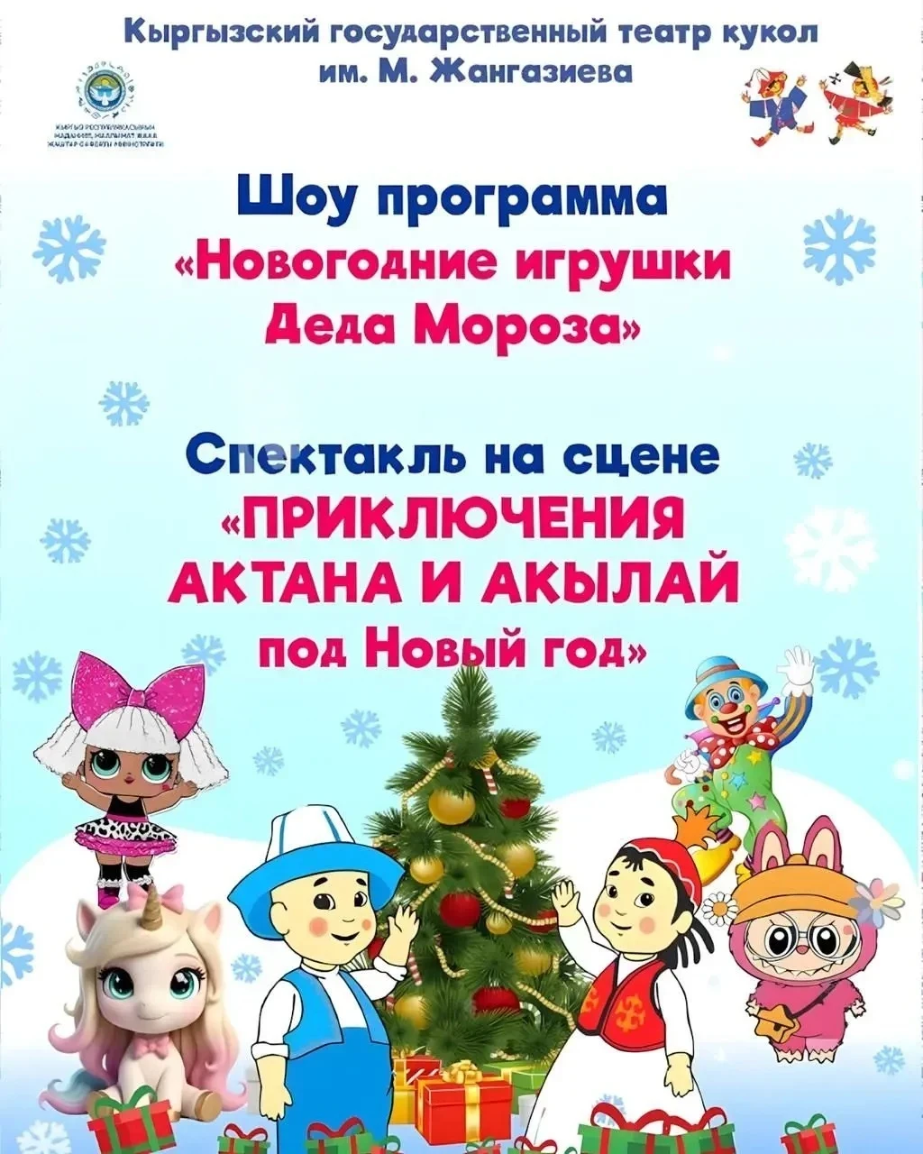 3 января Кыргызский государственный театр кукол имени М. Жангазиева представит шоу-программу «Новогодние игрушки Деда Мороза». Новый год — это время волшебства и радости, когда дети с нетерпением ждут чудес. В этой программе Дед Мороз создает новые игрушки, но одна из них пропадает. Снегурочка, кукла Лол и клоун отправляются на поиски пропажи, погружая зрителей в мир волшебства, игр и удивительных приключений.Кроме того, также пройдет спектакль «Приключения Актана и Акылай под Новый год», рассказывающий о том, как герои готовятся к празднику и преодолевают конфликты, чтобы встретить Новый год с чистыми сердцами.