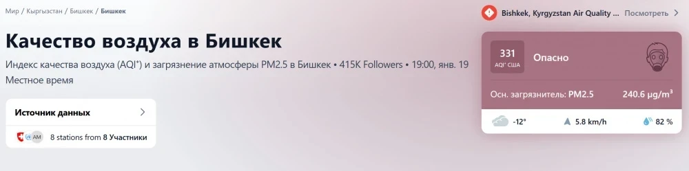 Кроме того, уровень мелкодисперсных частиц PM2.5 в Бишкеке превышает среднегодовые значения, установленные Всемирной организацией здравоохранения, в 48,1 раза. На момент 19:00 статус города оставался на уровне "опасно".
