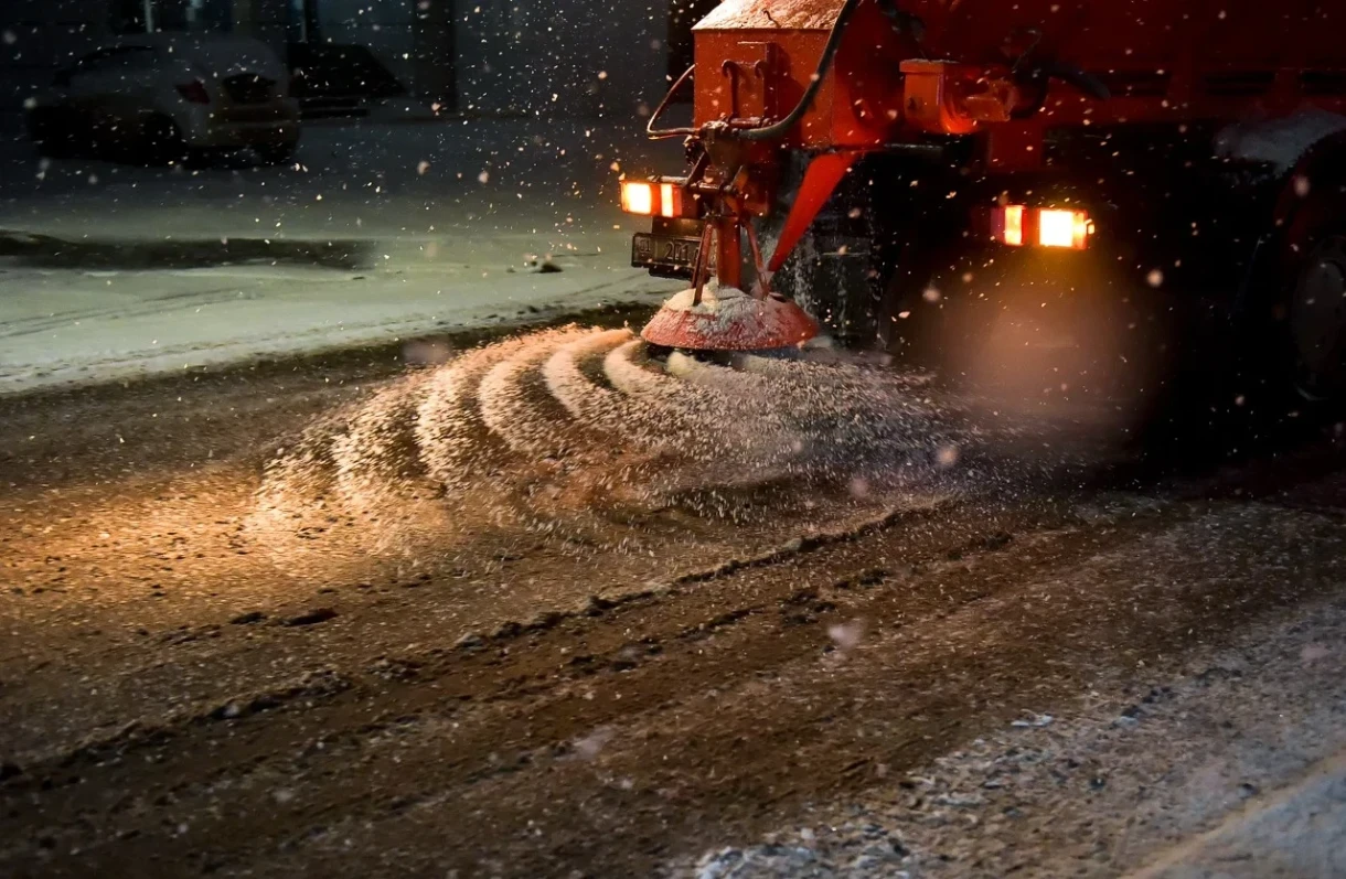 В целях предотвращения гололеда началась подсыпка противогололедных материалов. Очистка дорожной сети и тротуаров уже underway.