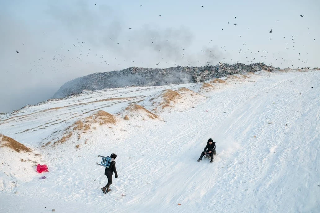 На выставке также представлены фотографии Токтогульского водохранилища, где уровень воды заметно снизился — это еще одно свидетельство климатических изменений. В отдельный блок выделена экологическая обстановка в столице, где кадры смога соседствуют с одной из самых насыщенных серий — изображениями городской свалки.