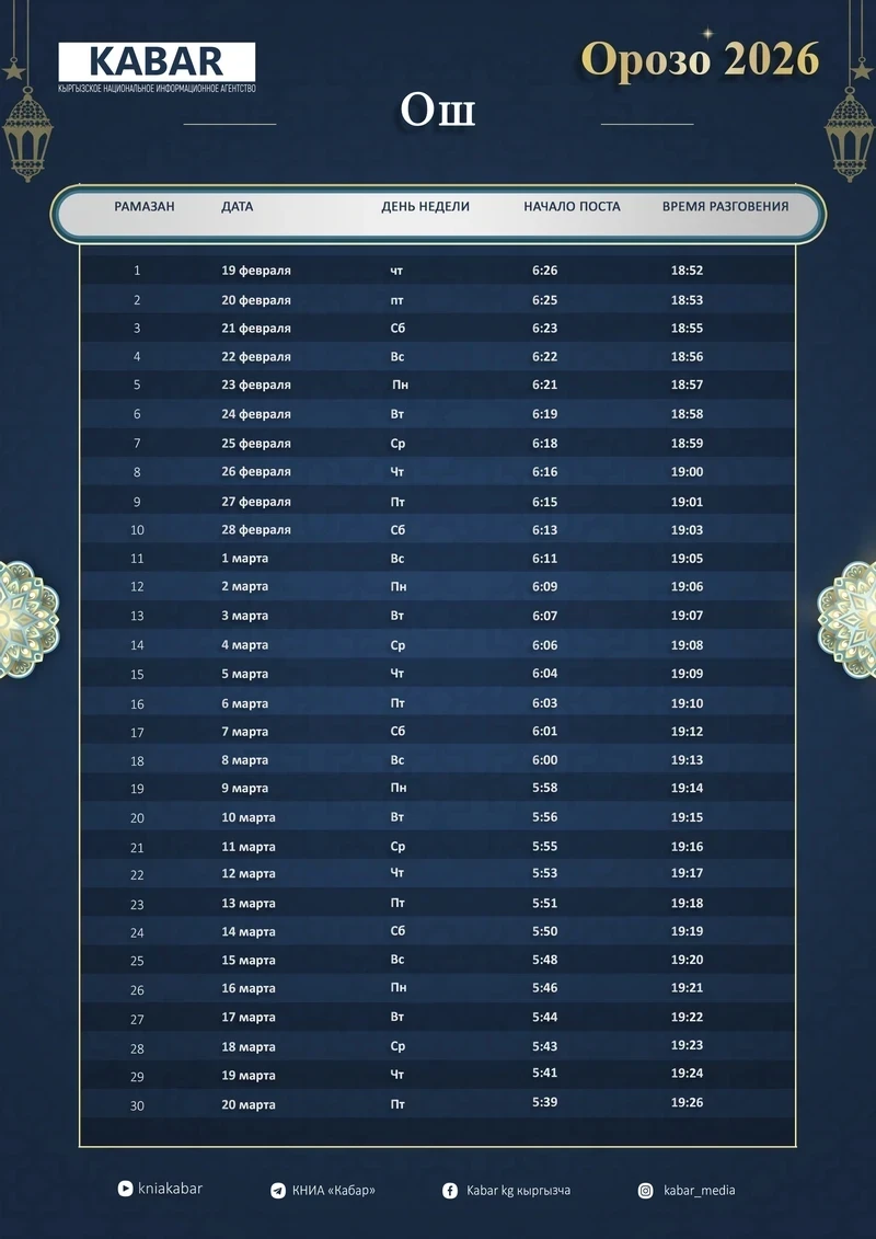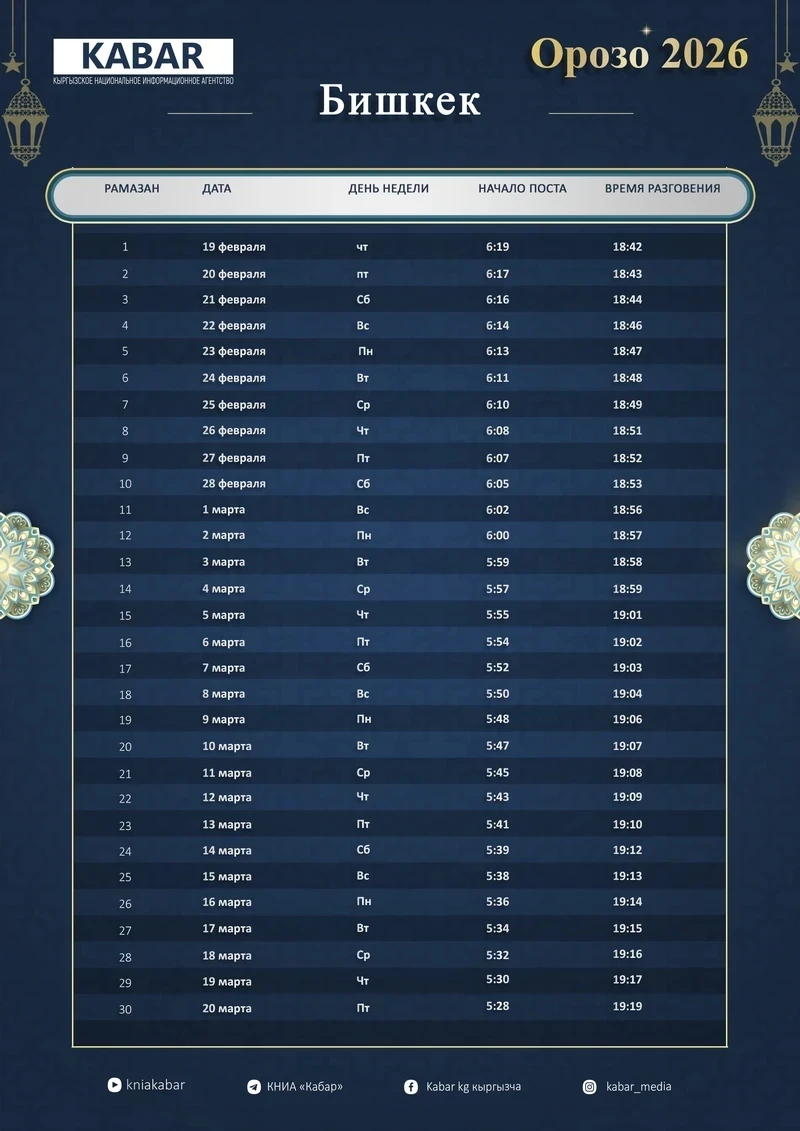 В 2026 году месяц Орозо в Кыргызстане начнется 19 февраля. На протяжении почти целого месяца мусульмане страны будут соблюдать священный пост, который символизирует духовное обновление, единство и благодарность. Этот важный период ассоциируется с очищением сердца, милосердием, прощением, а также укреплением любви и уважения между людьми.