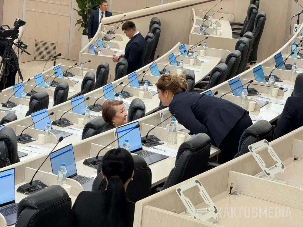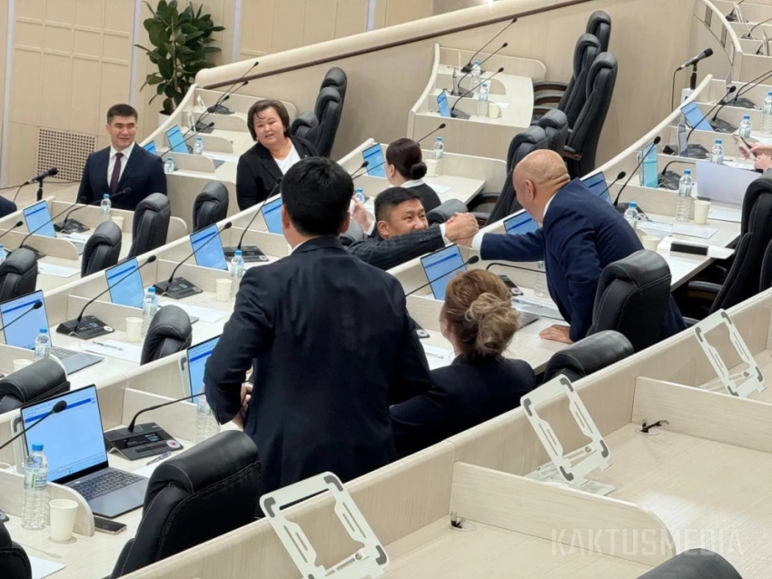 Также в зале заседаний находятся премьер-министр Адылбек Касымалиев, члены правительства и представители Центральной комиссии по выборам и референдумам.