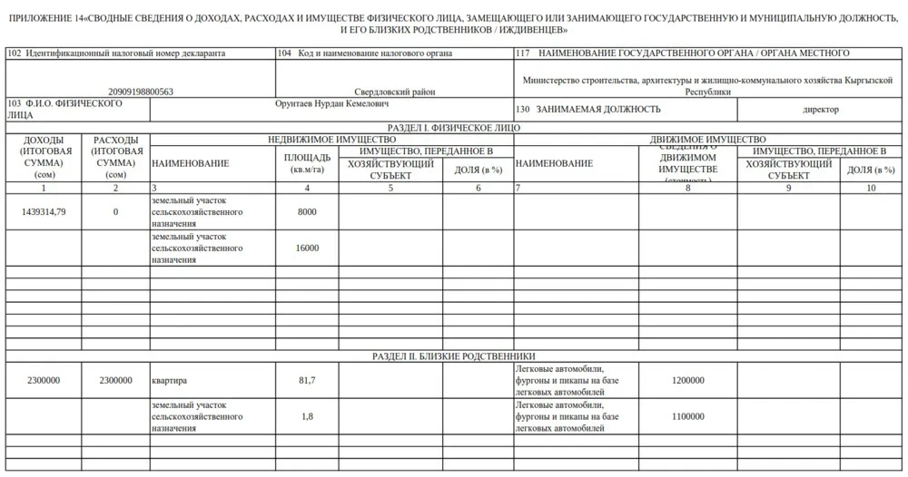 Что касается его близких родственников, то их доход составил 2 миллиона 300 тысяч сомов, и такая же сумма была указана в разделе расходов.