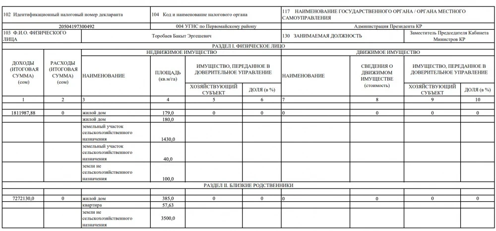 Заместитель главы кабинета министров и министр сельского хозяйства Торобаев отчитался о доходах в 1 млн 811 тыс. 987,88 сома. Расходы не указаны. В его собственности находятся два дома (179 и 180 кв. м) и три земельных участка общей площадью 0,7 га.