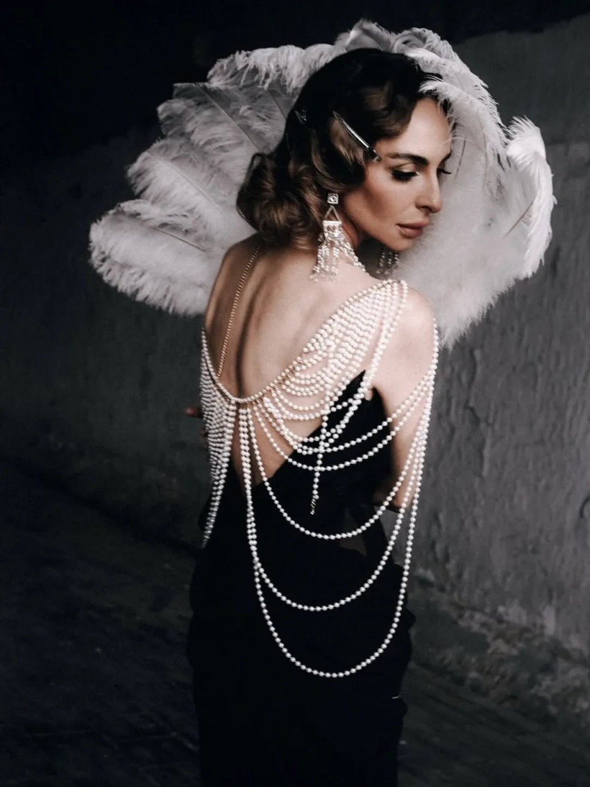 Екатерина Варнава снялась в новой фотосессии в стиле старого Голливуда. 40-летняя актриса опубликовала снимки в соцсетях, на которых она позирует в чёрном платье Say No More с глубоким декольте и украшениях Dzhanelli. Образ екатерины дополняет веер из перьев и укладка в стиле 1930-х.