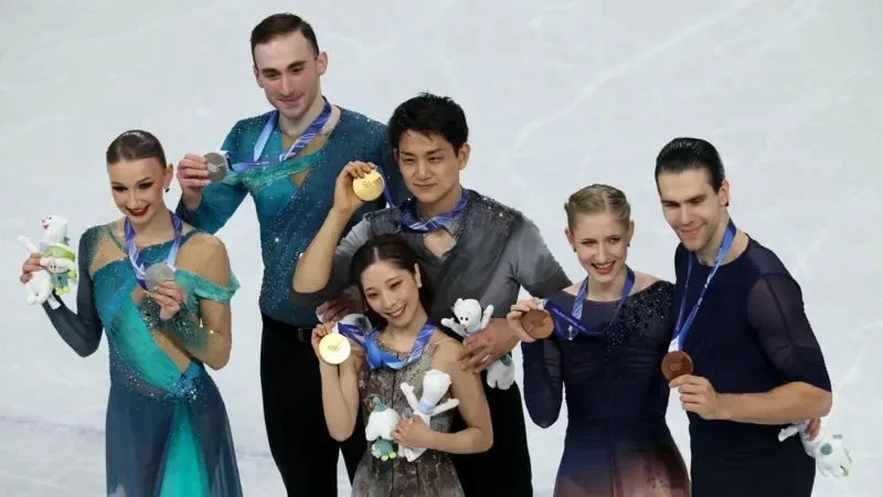 В центре: Рику Миура и Рюити Кихара (Япония), слева Анастасия Метелкина и Лука Берулава (Грузия), справа Минерва Фабьенне Хазе и Никита Володин (Германия). Фото EPA/Shutterstock.