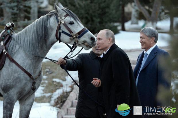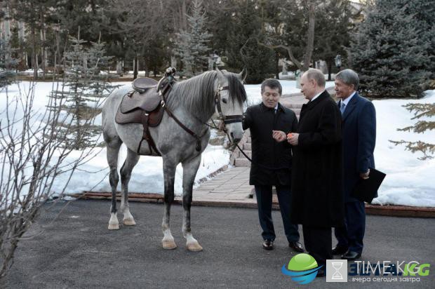 Атамбаев подарил Путину породистого скакуна. В администрации президента Кыргызстана заявили, что данный презент является традиционным проявлением гостеприимства.