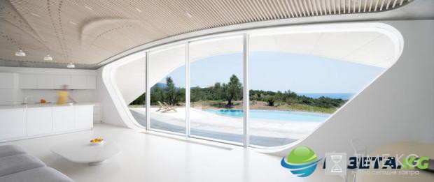 Выполненный в футуристической манере дизайн экстерьера Villa Ypsilon имеет продолжение в интерьере сооружения. Несмотря на то, что вилла возведена в жарком Средиземноморье, там поддерживается комфортная температура на протяжении всего дня без дополнительной системы охлаждения. Это достигается за счет продуманной технологии вентиляции и обильного земляного покрова крыши.