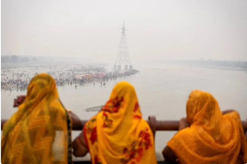 Индуисты поклоняются богу Солнца на берегах реки Ямуны в Нойде 28 октября 2025 года