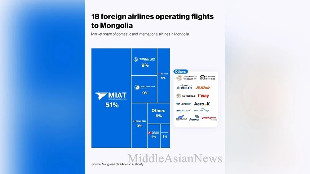 В настоящее время в Монголию выполняют рейсы 18 иностранных авиакомпаний. Большинство рейсов прибывает из Республики Корея, России (4) и Китая (3). Кроме того, этим летом компании из Турции и Таиланда планируют осуществить 10 116 рейсов по 22 направлениям.