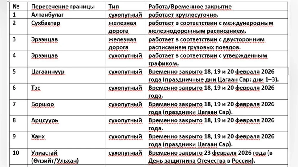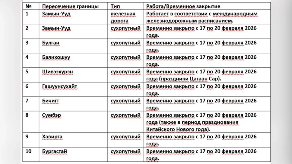 С 17 по 20 февраля 2026 года Монголия приостановит работу автомобильных пограничных переходов с Россией и Китаем в честь традиционного Нового года Цагаан Сар.
