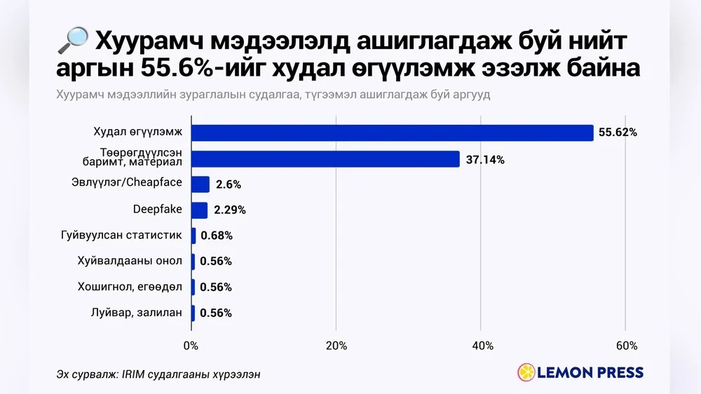 Сети троллей: Организованные и финансируемые лица с политическими или коммерческими интересами сети фейковых аккаунтов в социальных сетях представляют собой значительный инструмент для распространения дезинформации. По данным Главного управления полиции, в Монголии к 2023 году могло быть создано около 400 000 фальшивых аккаунтов.