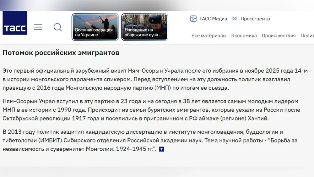 ТАСС сообщило, что «это первый официальный зарубежный визит Ням-Осорына Учрала с момента его избрания в ноябре 2025 года 14-м спикером парламента Монголии», и что он якобы является потомком русских эмигрантов.